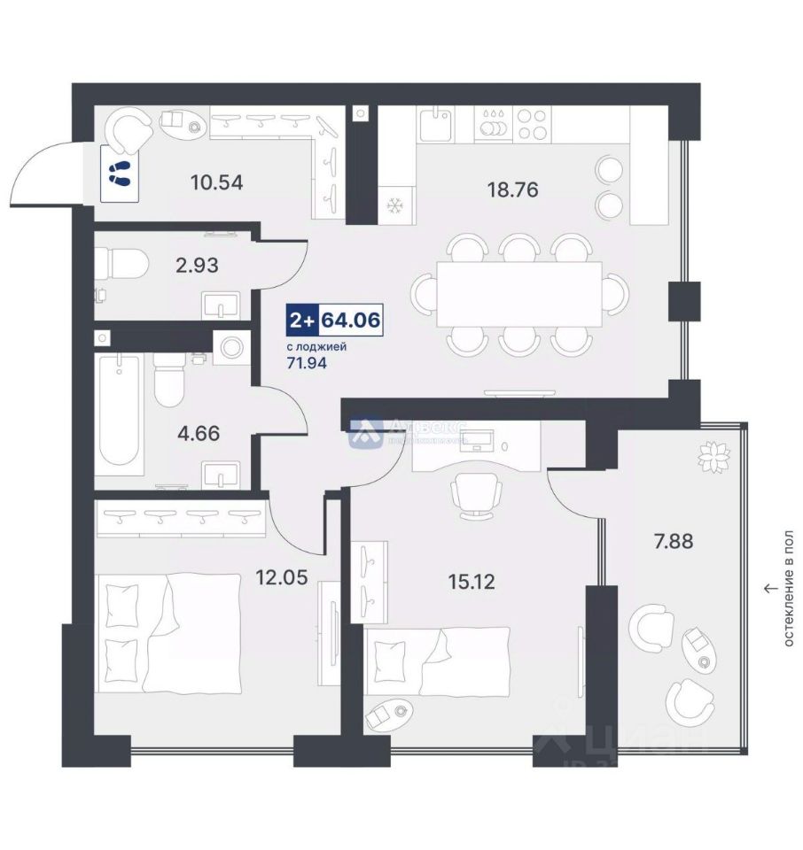 - Просторная квартира с площадью 64.06 кв.м.