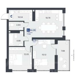 Данный объявление предлагает квартиру в новостройке, которая находится на 3 этаже 18 этажного дома. Площадь квартиры составляет 64.06 кв.м., из них 18.76 кв.м приходится на кухню.