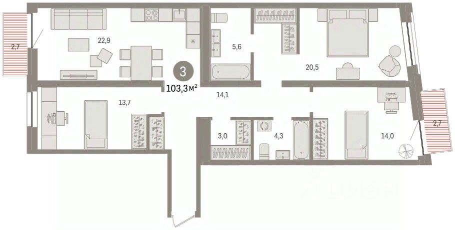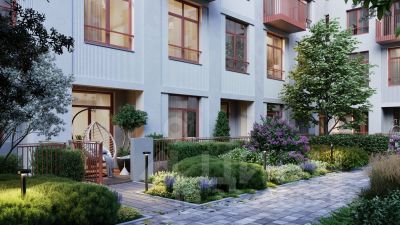 Квартира с кухней-гостиной и тремя спальнями в жилом районе "Речной порт". Особенности планировки: балкон, предчистовая отделка, разнесённые спальни.
