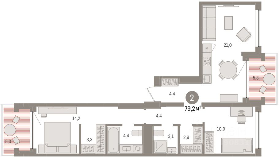 Квартира с кухней-гостиной и двумя спальнями в Доме у озера. Особенности планировки: мастер-спальня, предчистовая отделка.