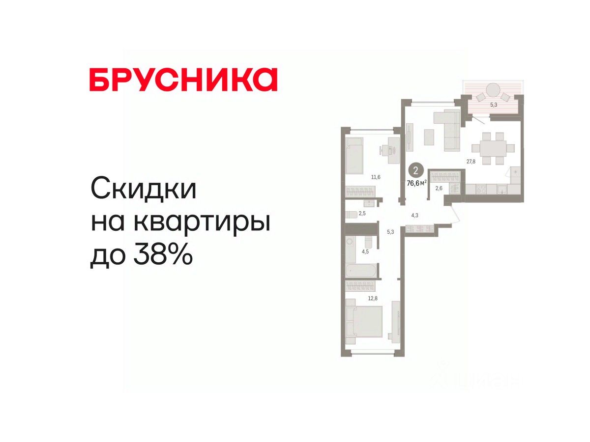 Квартира с кухней-гостиной и двумя спальнями в Доме у озера. Особенности планировки: второй санузел, окна на две стороны, предчистовая отделка.