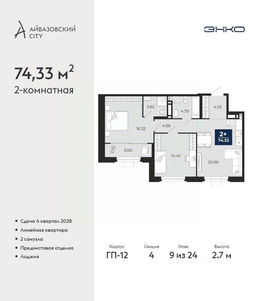 Продается двухкомнатная квартира с предчистовой отделкой в ЖК "Айвазовский City" на 9 этаже. Общая площадь: 74.33 кв.м., жилая: 30.74 кв.м., площадь просторной кухни-столовой: 20.86 кв.м. Комнаты изолированные, все окна выходят на одну сторону. В квартире одна лоджия, два совмещенных санузла. Высота потолков 2.7 м.