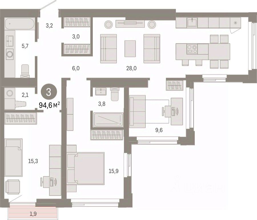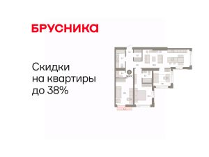 Квартира с кухней-гостиной и тремя спальнями в жилом районе "Зарека". Особенности планировки: мастер-спальня, предчистовая отделка.