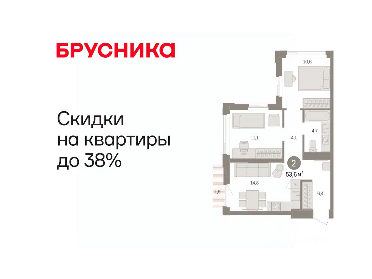 Квартира с кухней-гостиной и двумя спальнями в жилом районе "Зарека". Особенности планировки: предчистовая отделка.