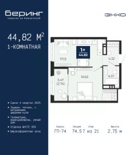 Продается 1-комн. квартира от застройщика в ЖК "Беринг" на 7 этаже. Квартира без отделки, полностью готова к ремонту. Общая площадь: 44.82 кв.м., жилая: 16.62 кв.м., площадь просторной кухни-столовой: 17.13 кв.м. Все окна выходят на одну сторону. В квартире одна лоджия, один совмещенный санузел. Высота потолков 2.75 м.