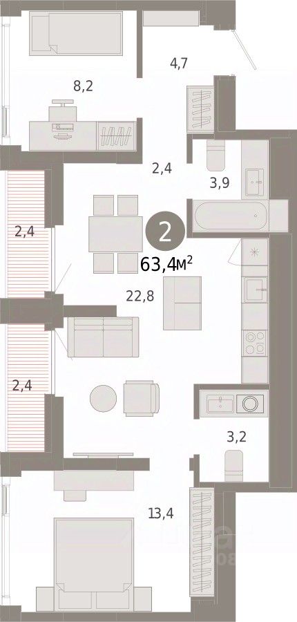 Квартира с кухней-гостиной и двумя спальнями в жилом районе "Зарека". Особенности планировки: предчистовая отделка.