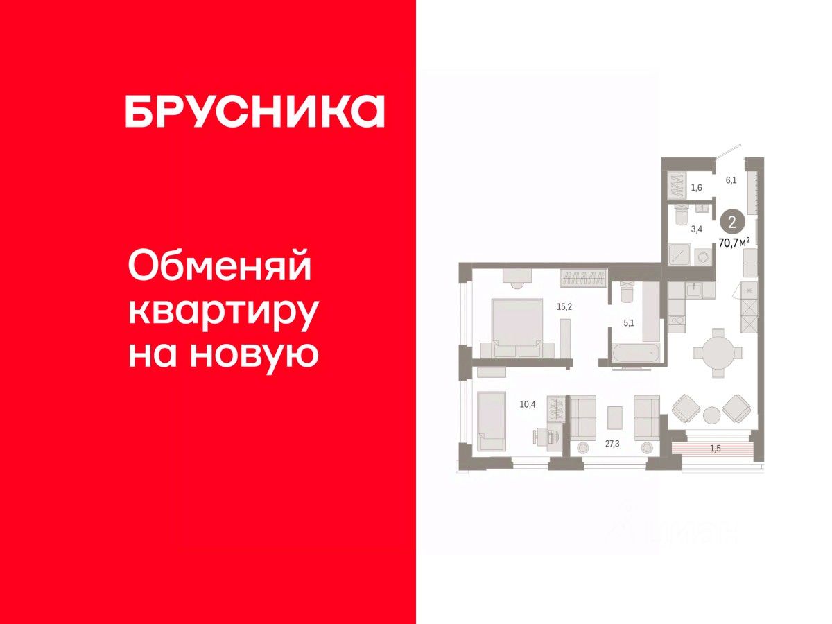 Квартира с кухней-гостиной и двумя спальнями в жилом районе "Зарека". Особенности планировки: предчистовая отделка, терраса на крыше.