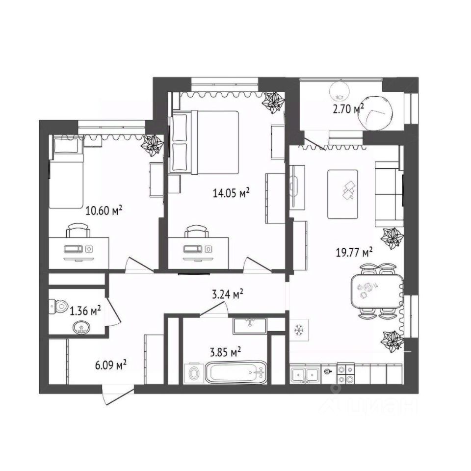 • 2 изолированные спальни — приватность и тишина для всех жильцов
