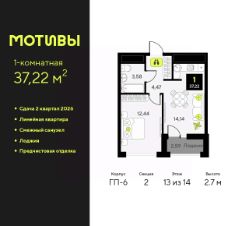 Продается 1-комн. квартира с предчистовой отделкой в ЖК "Мотивы" на 13 этаже. Общая площадь: 37.22 кв.м., жилая: 12.44 кв.м., площадь просторной кухни-столовой: 14.14 кв.м. Все окна выходят на одну сторону. В квартире одна лоджия, один совмещенный санузел. Высота потолков 2.7 м.