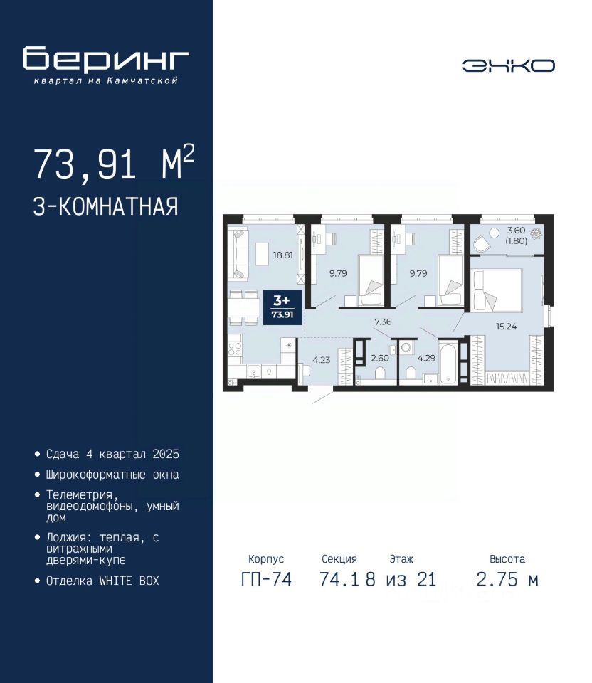 Продается 3-комн. квартира в ЖК "Беринг" на 8 этаже. Квартира без отделки, новый собственник может сделать ремонт по своему проекту. Общая площадь: 73.91 кв.м., жилая: 34.82 кв.м., площадь просторной кухни-столовой: 18.81 кв.м. Квартира угловая, окна oбecпeчивaют paвнoмepнoe ocвeщeниe в тeчeниe дня. В квартире одна лоджия, один совмещенный и один раздельный санузел. Высота потолков 2.75 м.