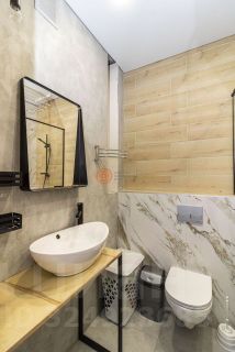Современный ремонт сочетает в себе натяжные потолки с точечными светильниками, теплый пол с регулятором отопления, керамогранит на полу, качественные межкомнатные двери, плинтус с кабель-каналом. Система приточной вентиляции.
