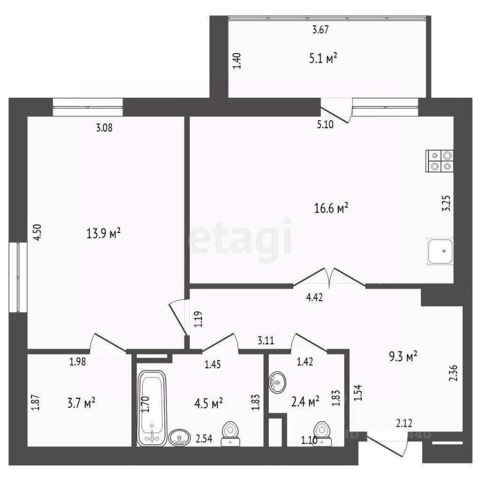 Планировочное решение с выделенной зоной кухни-гостиной и свободным пространством предоставляет широкие возможности для обустройства, а наличие балкона добавляет функциональности. Так же дополнительный комфорт дадут 2 санузла и отдельная гардеробная.