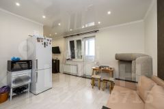 Квартира полностью готова к проживанию: выполнен косметический ремонт, в комнате на полу ламинат, линолеум в ванной. На стенах обои, в ванной пластиковые панели, натяжные потолки со встроенными светильниками. В стоимость входит вся необходимая мебель и бытовая техника.