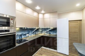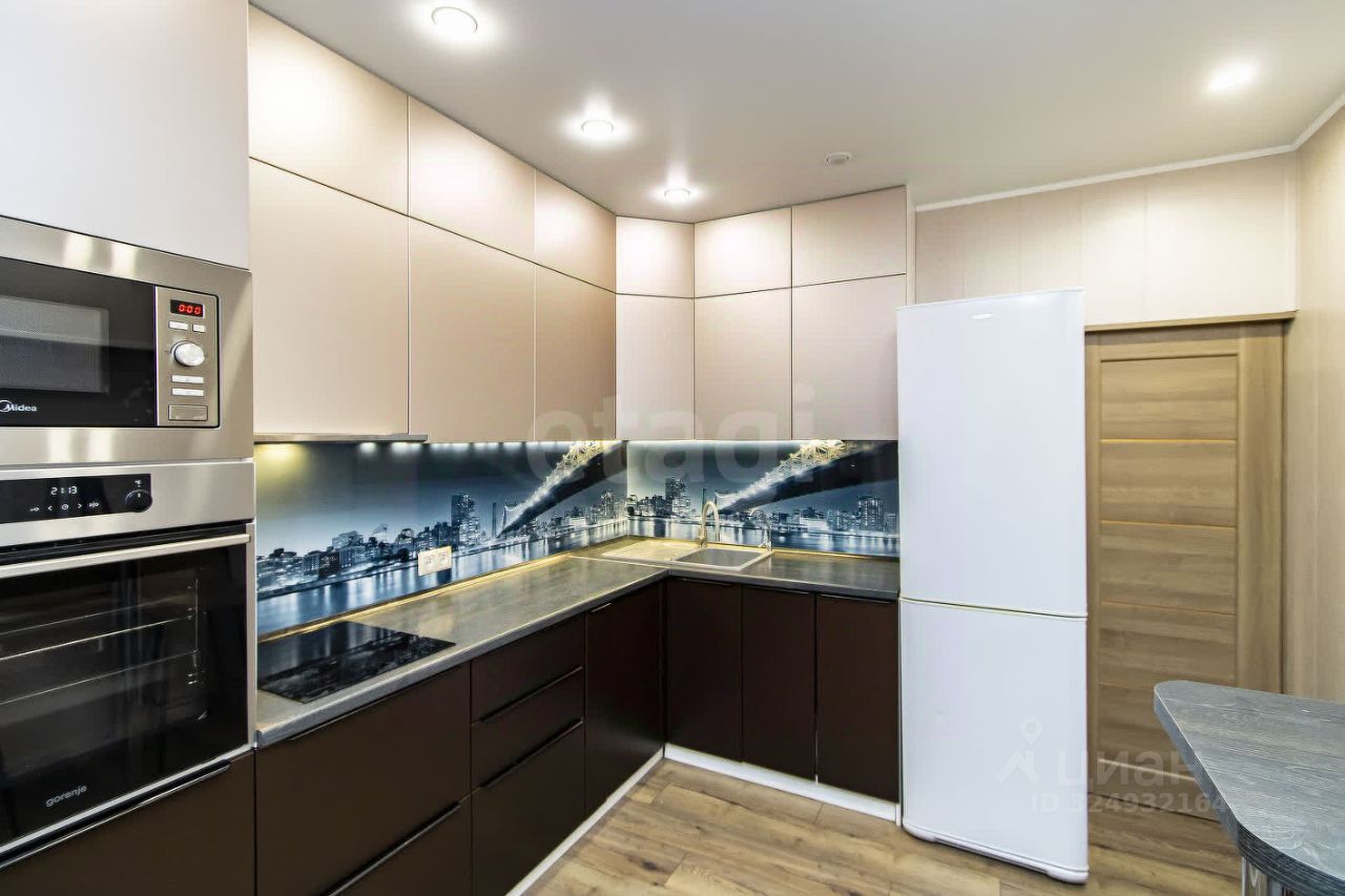 — Просторная кухня-гостиная, укомплектованная стильной мебелью и встроенной техникой.