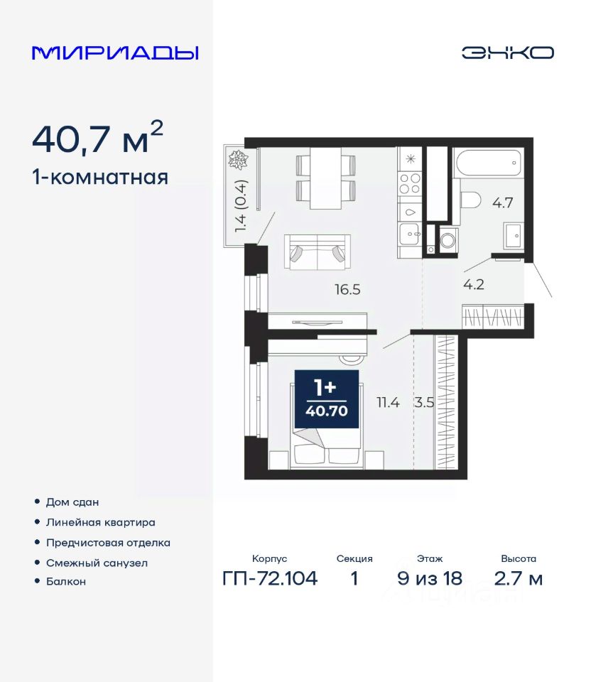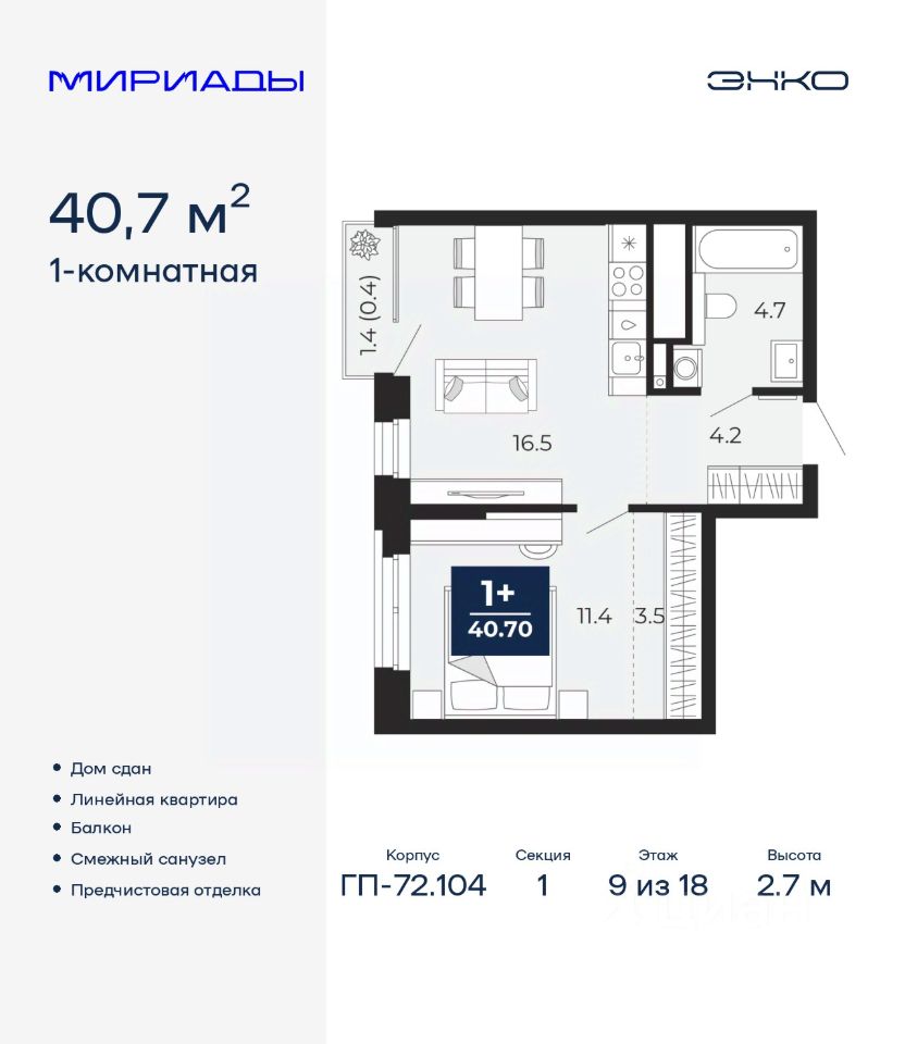Продается 1-комн. квартира от застройщика с предчистовой отделкой в ЖК "Мириады" на 9 этаже. Общая площадь: 40.7 кв.м., жилая: 11.4 кв.м., площадь просторной кухни-столовой: 16.5 кв.м. Все окна выходят на одну сторону. В квартире один балкон, один совмещенный санузел. Высота потолков 2.7 м.