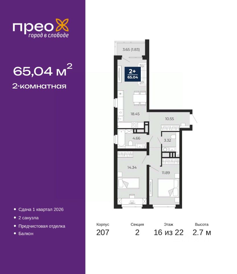 2-комн. квартира с предчистовой отделкой в ЖК "Прео" на 16 этаже. Общая площадь: 65.04 кв.м., жилая: 26.23 кв.м., площадь просторной кухни-столовой: 18.45 кв.м. Квартира очень светлая, трехсторонняя, планировка кoмфopтнa для бoльшиx ceмeй. В квартире один балкон, один совмещенный и один раздельный санузел. Высота потолков 2.7 м.