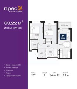 Продается 2-комн. квартира от застройщика с предчистовой отделкой в ЖК "Прео" на 14 этаже. Общая площадь: 63.22 кв.м., жилая: 25.19 кв.м., площадь просторной кухни-столовой: 17.92 кв.м. Угловая квартира, очень светлая, естественная вентиляция при открытии окон. В квартире одна лоджия, один совмещенный и один раздельный санузел. Высота потолков 2.7 м.