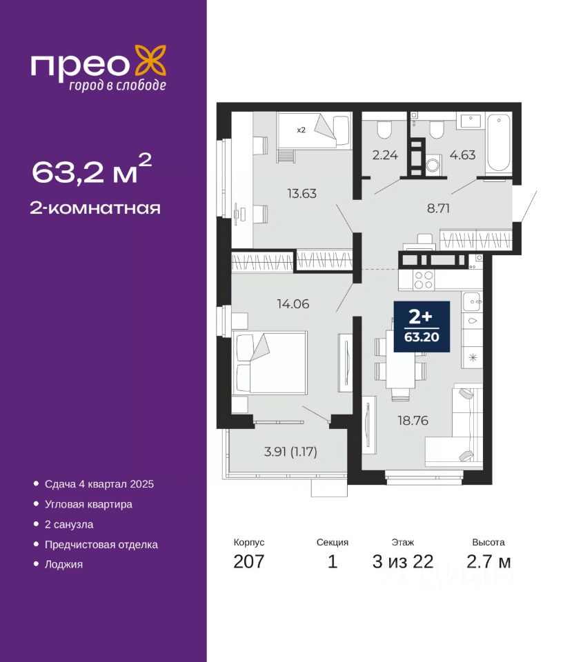 Двухкомнатная квартира от застройщика с предчистовой отделкой в ЖК "Прео" на 3 этаже. Общая площадь: 63.2 кв.м., жилая: 27.69 кв.м., площадь просторной кухни-столовой: 18.76 кв.м. Угловая квартира, идеально подойдет любителям тишины и панорамных видов. В квартире одна лоджия, один совмещенный и один раздельный санузел. Высота потолков 2.7 м.