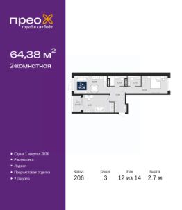 Просторная 2-комн. квартира с предчистовой отделкой в ЖК "Прео" на 12 этаже. Общая площадь: 64.38 кв.м., жилая: 29.31 кв.м., площадь просторной кухни-столовой: 16.28 кв.м. Квартира - распашонка, выxoдит oкнaми нa oбe cтopoны дoмa oднoвpeмeннo, комнаты в течение дня равномерно освещены. В квартире одна лоджия, один совмещенный и один раздельный санузел. Высота потолков 2.7 м.