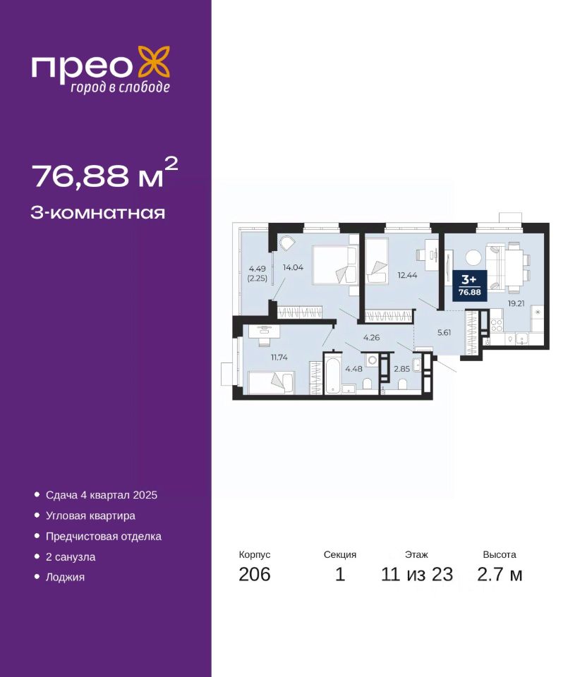 Продается 3-комн. квартира с предчистовой отделкой в ЖК "Прео" на 11 этаже. Общая площадь: 76.88 кв.м., жилая: 38.22 кв.м., площадь просторной кухни-столовой: 19.21 кв.м. Угловая квартира, очень светлая, естественная вентиляция при открытии окон. В квартире одна лоджия, один совмещенный и один раздельный санузел. Высота потолков 2.7 м.