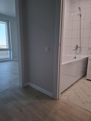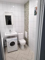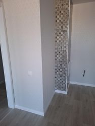 Квартира с чистовой отделкой: стены оклеены обоями теплых тонов, натяжные потолки создают ощущение простора, на полу уложен современный линолеум. Санузел облицован керамической плиткой высокого качества, установлена хорошая сантехника, включая душевую кабину или ванну, раковину с тумбой и стиральную машину.