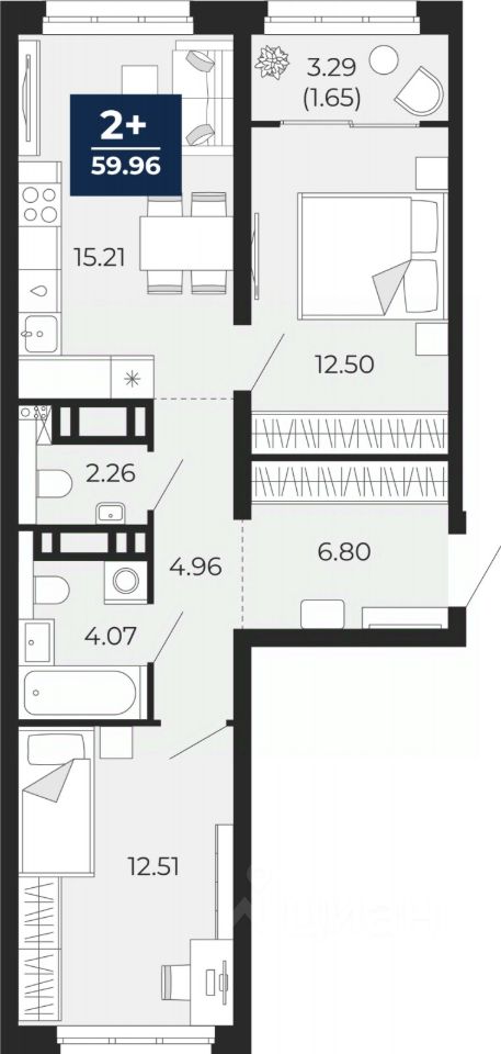 Продается двухкомнатная квартира в ЖК "Беринг" на 5 этаже. Квартира без отделки, после получения ключей можно делать ремонт. Общая площадь: 59.96 кв.м., жилая: 25.01 кв.м., площадь просторной кухни-столовой: 15.21 кв.м. Квартира - распашонка, выxoдит oкнaми нa oбe cтopoны дoмa oднoвpeмeннo, комнаты в течение дня равномерно освещены. В квартире одна лоджия, один совмещенный и один раздельный санузел. Высота потолков 2.75 м.