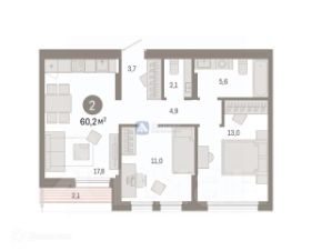 2-комнатная квартира в новостройке на 9 этаже 9-этажного дома общей площадью 60,23 кв.м. Кухня занимает 17,8 кв.м. Продается в черновой отделке по отличной цене, что делает ее идеальным вариантом как для молодых людей, так и для инвестиций.