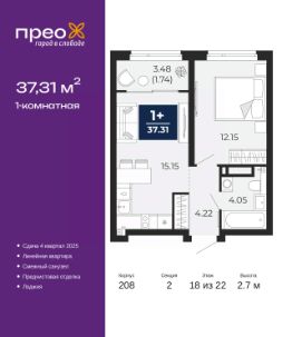 Однокомнатная квартира от застройщика с предчистовой отделкой в ЖК "Прео" на 18 этаже. Общая площадь: 37.31 кв.м., жилая: 12.15 кв.м., площадь просторной кухни-столовой: 15.15 кв.м. Все окна выходят на одну сторону. В квартире одна лоджия, один совмещенный санузел. Высота потолков 2.7 м.