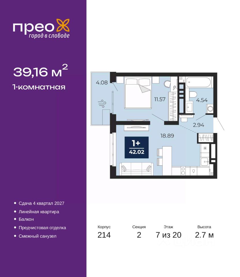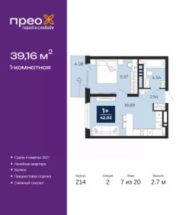 1-комн. квартира от застройщика с предчистовой отделкой в ЖК "Прео" на 7 этаже. Общая площадь: 39.16 кв.м., жилая: 11.57 кв.м., площадь просторной кухни-столовой: 18.89 кв.м. Все окна выходят на одну сторону. В квартире один балкон, один совмещенный санузел. Высота потолков 2.7 м.
