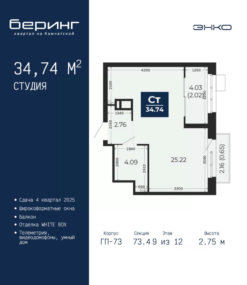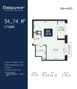 1-комн. квартира-студия в ЖК "Беринг" на 9 этаже. Квартира без отделки, новый собственник может сделать ремонт по индивидуальному дизайн-проекту. Общая площадь: 34.74 кв.м., площадь гостиной 25.22 кв.м., из которых 5 кв.м. выделено под кухонную зону. Все окна выходят на одну сторону. В квартире один балкон, один совмещенный санузел. Высота потолков 2.75 м.
