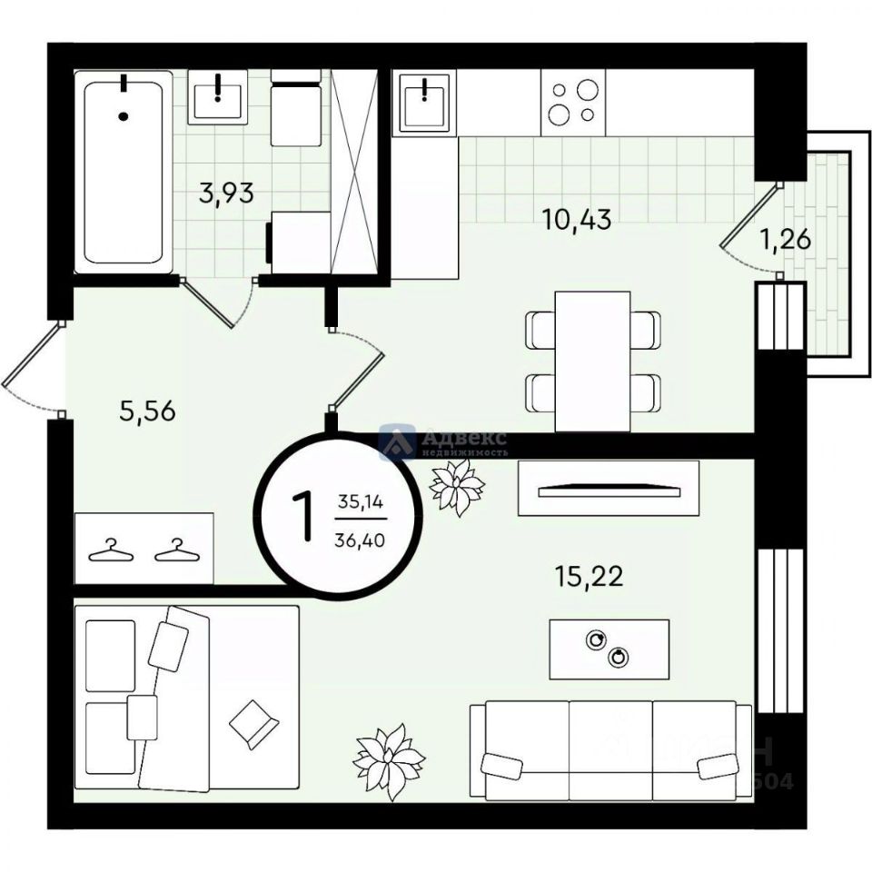 классическая планировка площадью 36,4 кв.м. - максимальное удобство.