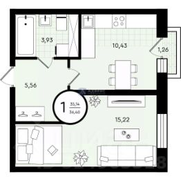 классическая планировка площадью 36,4 кв.м. - максимальное удобство.