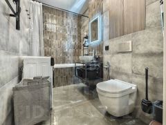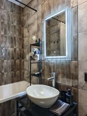 - В ванной комнате использованы качественные материалы, что придаёт ей стильный вид. Функциональная сантехника и достаточное пространство для хранения делают её максимально удобной.