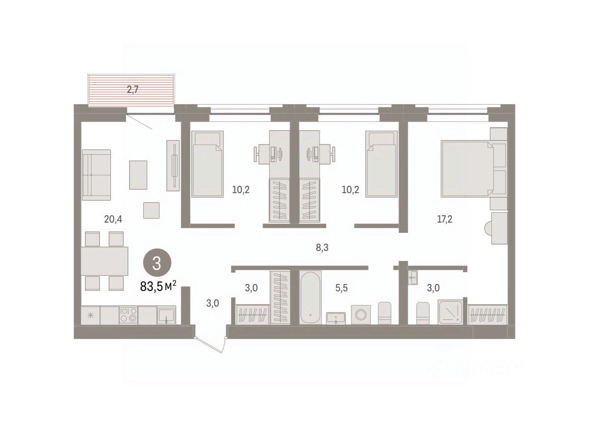 Квартира с кухней-гостиной и тремя спальнями в жилом районе "Речной порт". Особенности планировки: мастер-спальня, предчистовая отделка.