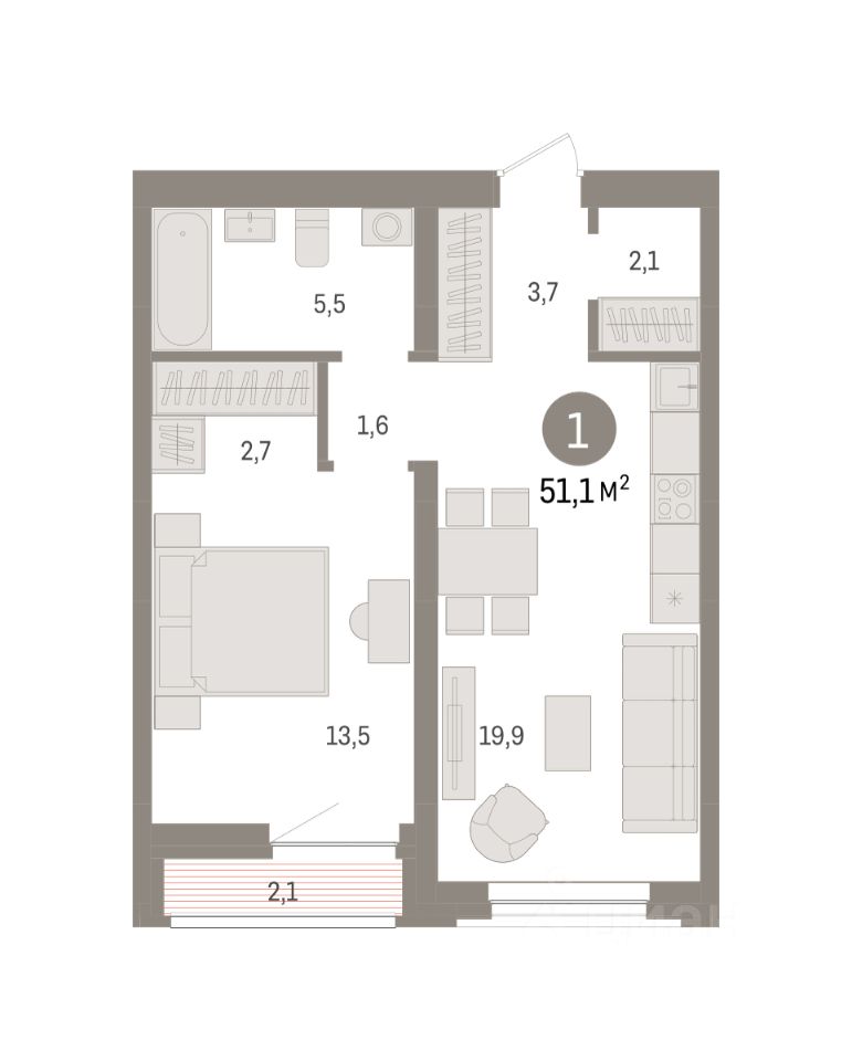 Квартира с кухней-гостиной и одной спальней в жилом районе "Речной порт". Особенности планировки: предчистовая отделка.