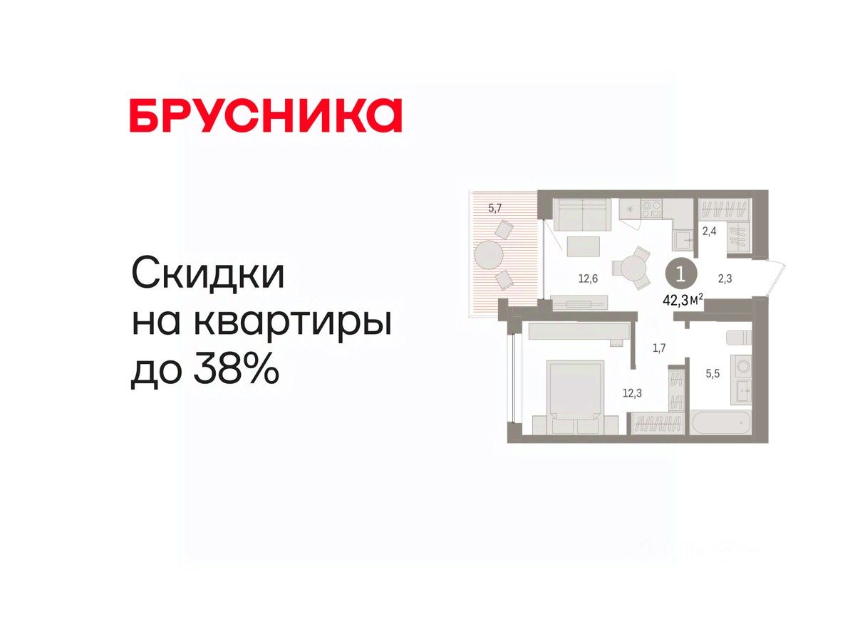 Однокомнатная квартира от застройщика с предчистовой отделкой в ЖК "Дом у озера" на 7 этаже. Общая площадь: 42.34 кв.м. Высота потолков 2.7 м.