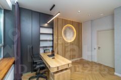 В жилых комнатах уложен кварц-винил благородной "ёлочкой", а кухня, прихожая, санузлы и кладовая покрыты керамогранитом с подогревом для максимального комфорта. Стены украшает декоративная штукатурка, дополненная натуральными дубовыми панелями и массивными подоконниками, создающими атмосферу эко-стиля. В гостиной и кухне использован топовый цвет 2025 года, а кабинет декорирован изысканным элементом в виде "луны" символа гармонии и изобилия. Встроенная LED-подсветка мягко подсвечивает интерьер, подчеркивая его глубину и элегантность.