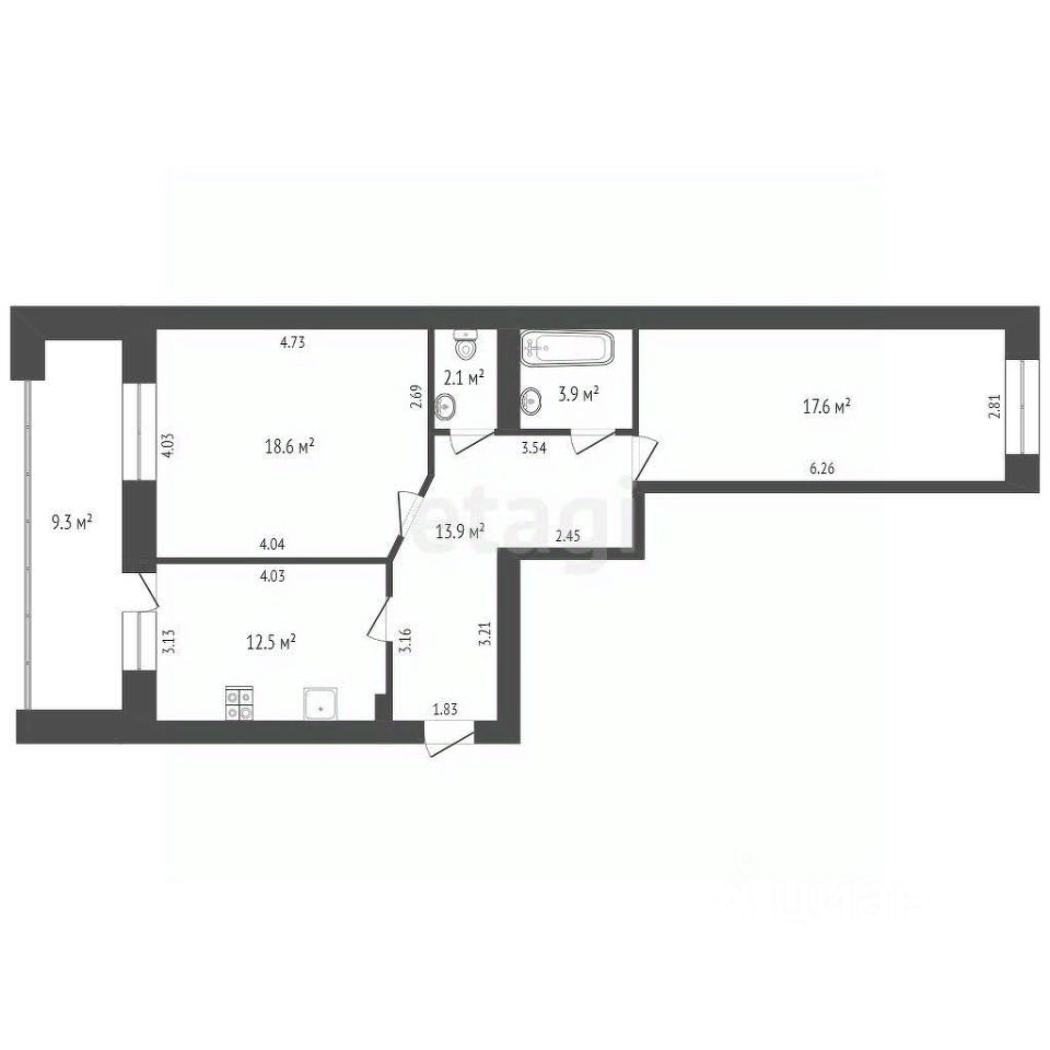 В квартире удобная и многофункциональная планировка (распашонка): светлая и просторная, кухня 12.5 м² и 2 комнаты правильной прямоугольной формы площадью 18.6 м² и 17.6 м².