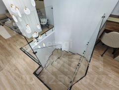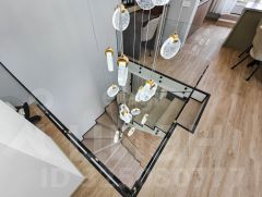 * Элегантная лестница, увенчанная каскадной дизайнерской люстрой.