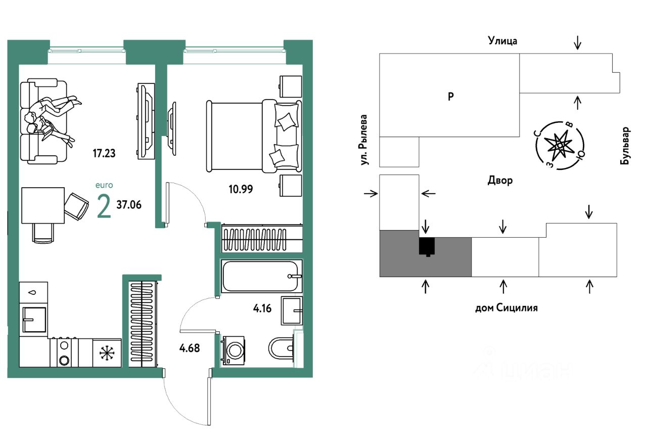 Продается 2комнатная квартира на 10 этаже от застройщика Страна Девелопмент. Площадь квартиры 37,06 кв. м.