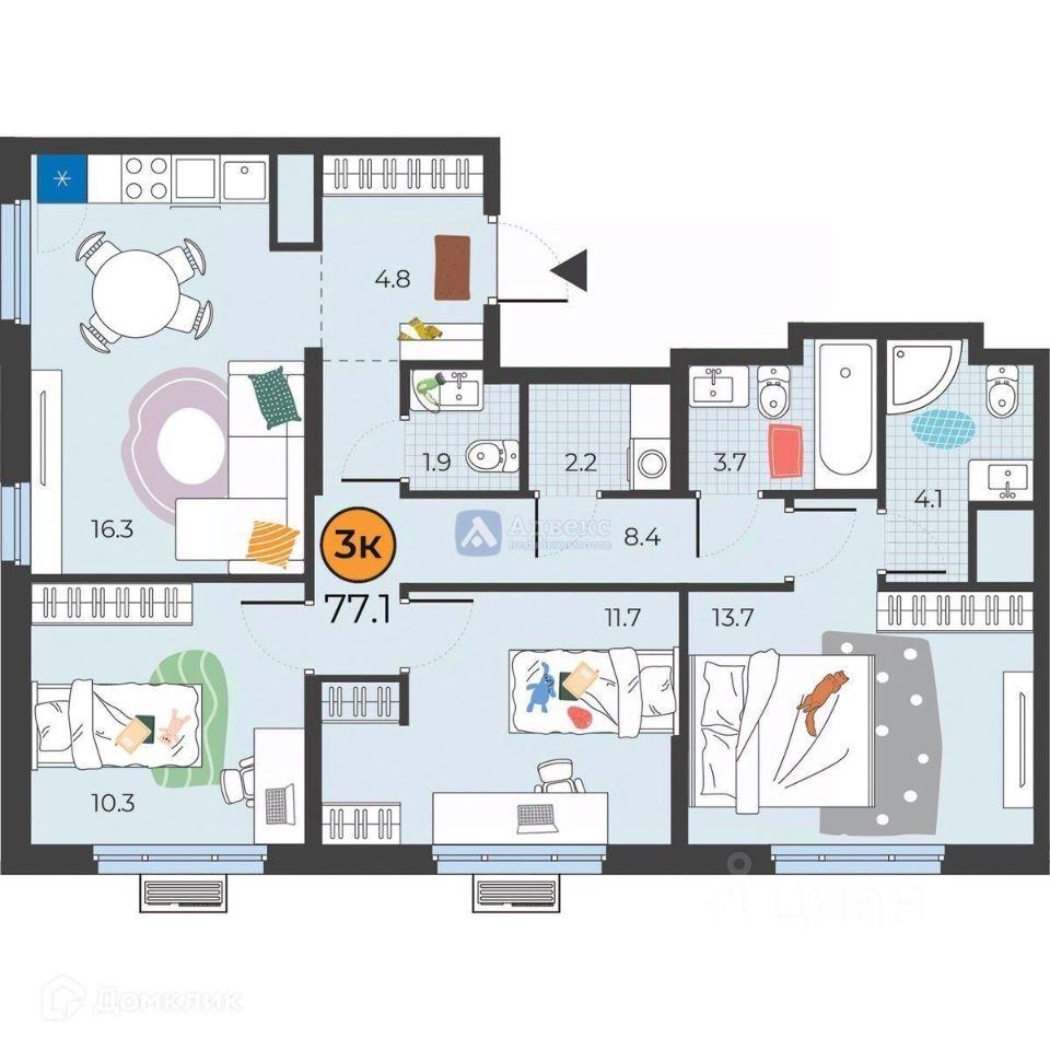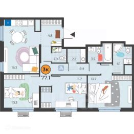 Продаётся просторная новостройка в жилом комплексе на 16 этаже 19-этажного дома. Квартира состоит из 3 комнат и общей площадью 77.10 кв.м. Кухня занимает 16.3 кв.м. идеально подходит для комфортного проживания семьи.