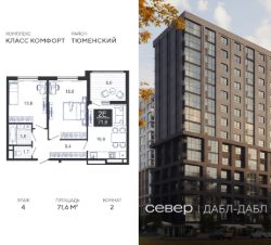 Продаётся квартира площадью 71.6 м2 в жилом комплексе "Дабл-Дабл". Квартира находится на 4 этаже, жилая площадь квартиры 31.8 м2, площадь просторной кухни — 16.9 м2. Среди особенностей планировки — изолированные комнаты с окнами на одну сторону, 1 совмещённый санузел.