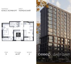 Продаётся квартира площадью 66 м2 в жилом комплексе "Дабл-Дабл". Квартира находится на 5 этаже, жилая площадь квартиры 28.9 м2, площадь просторной кухни — 17 м2. Среди особенностей планировки — изолированные комнаты с окнами на одну сторону, 1 совмещённый санузел.