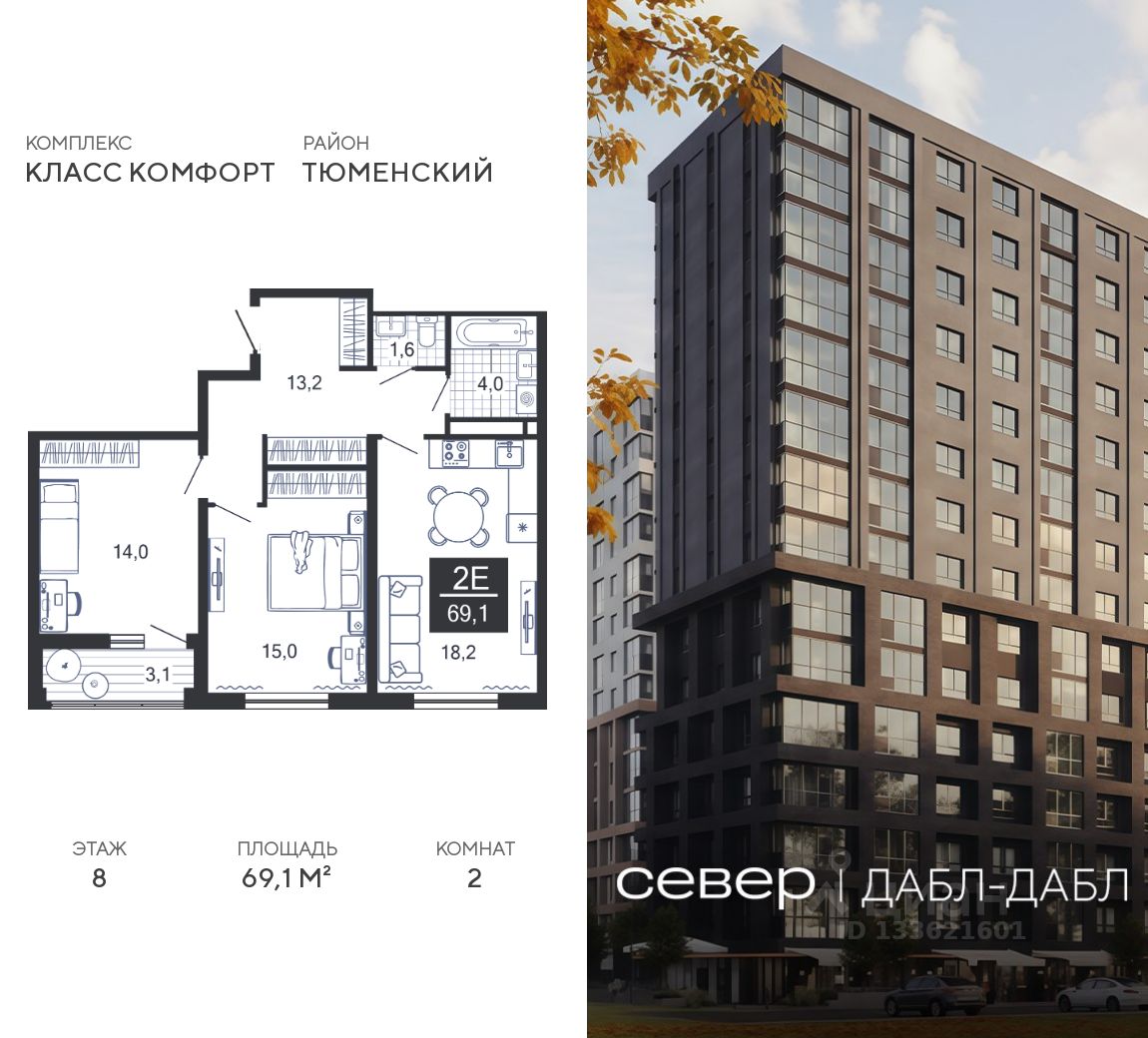 Продаётся квартира площадью 69.1 м2 в жилом комплексе "Дабл-Дабл". Квартира находится на 8 этаже, жилая площадь квартиры 29 м2, площадь просторной кухни — 18.2 м2. Среди особенностей планировки — изолированные комнаты с окнами на одну сторону, 1 совмещённый санузел.