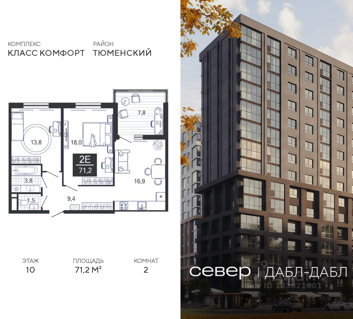 Продаётся квартира площадью 71.2 м2 в жилом комплексе "Дабл-Дабл". Квартира находится на 10 этаже, жилая площадь квартиры 31.8 м2, площадь просторной кухни — 16.9 м2. Среди особенностей планировки — изолированные комнаты с окнами на одну сторону, 1 совмещённый санузел.