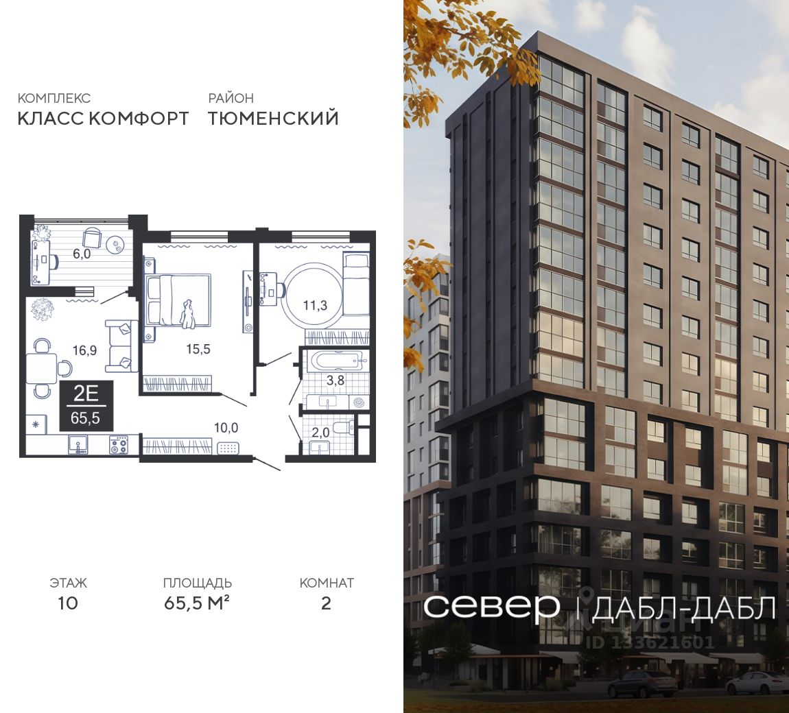 Продаётся квартира площадью 65.5 м2 в жилом комплексе "Дабл-Дабл". Квартира находится на 10 этаже, жилая площадь квартиры 26.8 м2, площадь просторной кухни — 16.9 м2. Среди особенностей планировки — изолированные комнаты с окнами на одну сторону, 1 совмещённый санузел.