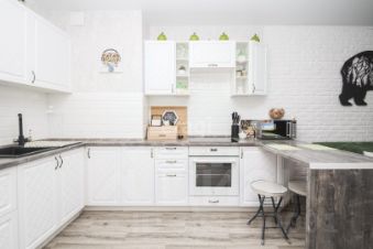 - Большая кухня-гостиная площадью около 20 квадратных метров, оборудованная качественным кухонным гарнитуром.