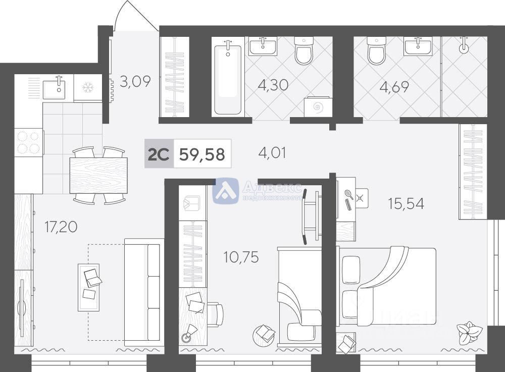 Прекрасное предложение для тех, кто ищет идеальный вариант жилья в новостройке! Продаётся двухкомнатная квартира на 16 этаже общей площадью 59,58 кв.м. с просторной кухней площадью 17,2 кв.м.