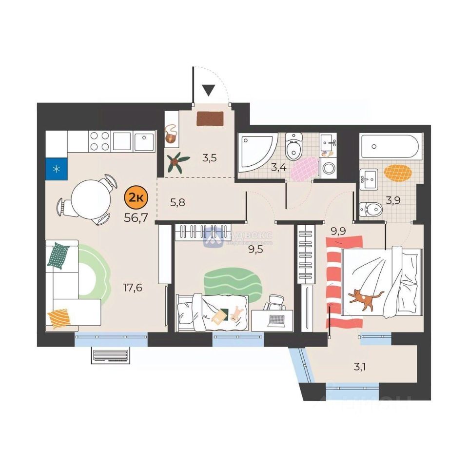 Планировка квартиры очень удобная, с просторной кухней и двумя отдельными комнатами, позволяющими создать уютное пространство для каждого члена семьи.