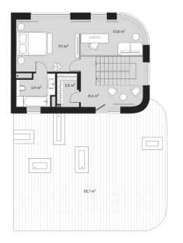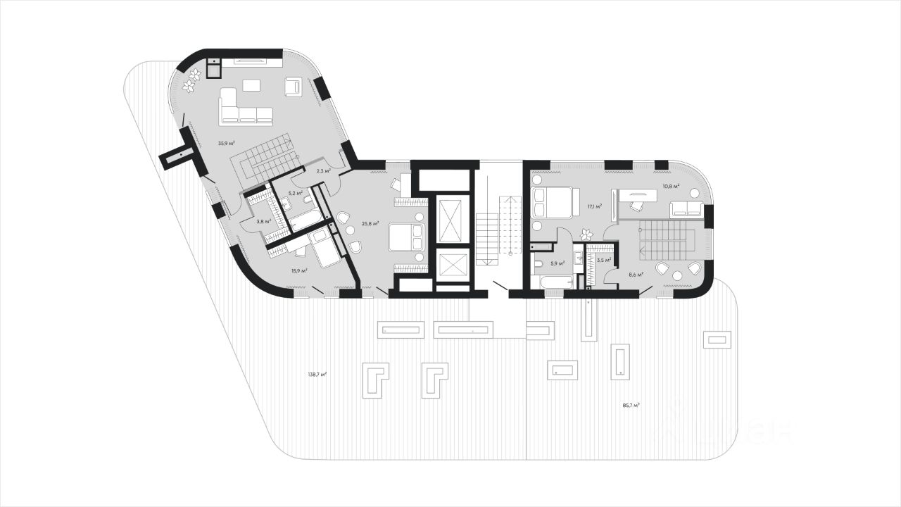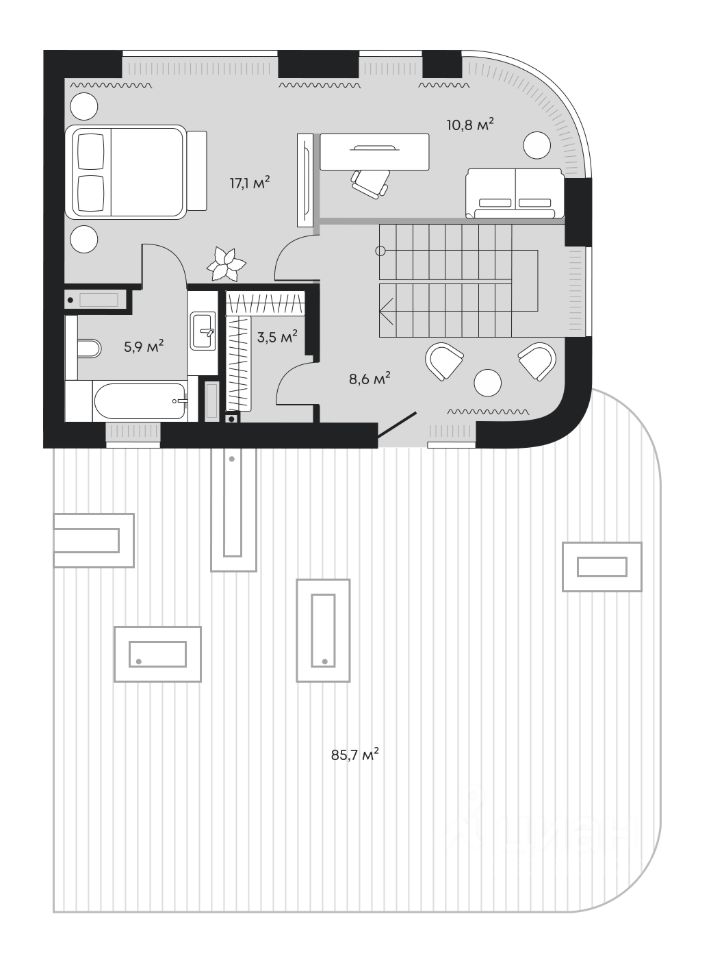 С террасы площадью 85,7 м² на последнем этаже открывается наилучший вид на весь центр, реку и Мост Влюблённых. Здесь можно организовать летнюю кухню, камерный кинотеатр или фитнес-зону.